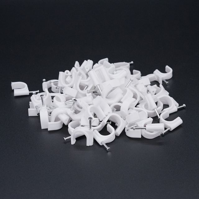 Конструкция скоб для кабеля позволяет быстро и надежно фиксировать круглый кабель на таких рабочих поверхностях как дерево и гипсокартон, а гвоздь из каленой стали позволяет производить надежную фиксацию кабеля без применения дополнительных фиксирующих элементов.