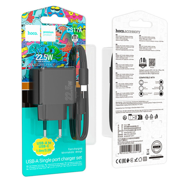 Набор HOCO CS17A+ сочетает в себе надежность, высокую скорость зарядки и удобство использования. Компактный размер адаптера позволяет легко брать его с собой, а качественный кабель обеспечивает стабильное соединение и долгий срок службы.