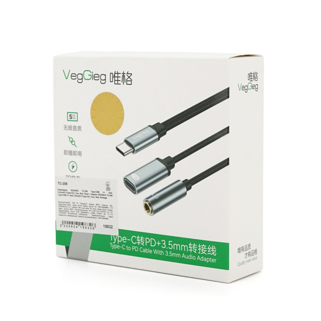 Переходник VEGGIEG TC-208 Type-C(M) => Jack 3.5mm(F)+Type-C(F), 5см, Silver/Black, Пакет