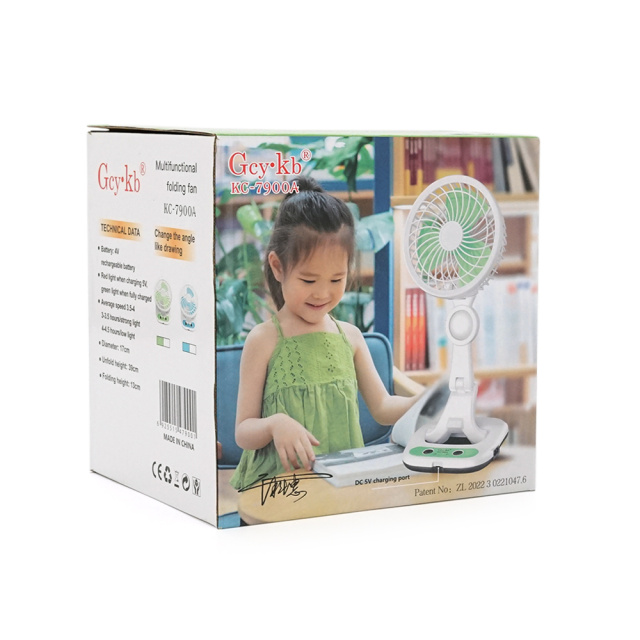 Портативный настольный вентилятор KC-7900A, R*160мм, 2 режима, фонарь, питание от аккумулятора 18650 ( вкомплекте только 1шт), USB кабель, Box