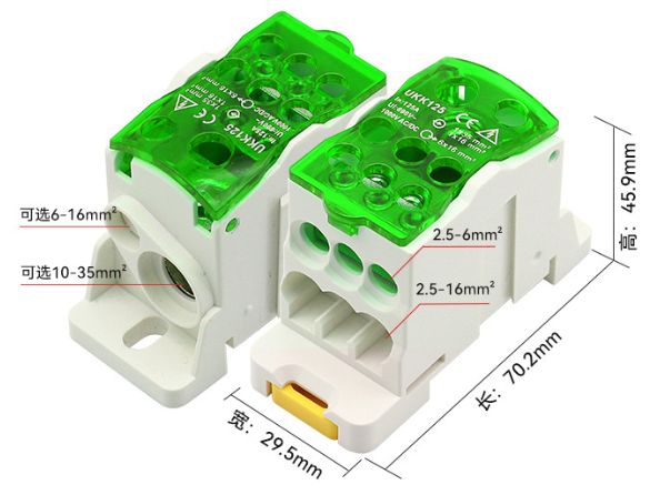 Параллельный разветвитель-сплиттер проводов UKK125, 6 выходов(латунь)6-2,5*16мм2 *1-10-35мм2 *1-6-16мм2, AC690V, 125А, 70,8*45,9*29.5мм, GREEN
