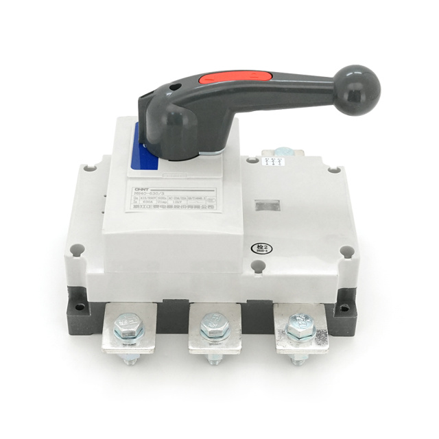 Ручной выключатель-разъединитель CHINT NH40-630/3P представляет собой трехполюсное коммутационное устройство ручного управления, предназначенное для оперативного включения и отключения электрических цепей под нагрузкой. Устройство рассчитано на номинальное напряжение 380V и токовую нагрузку до 630A. Конструкция обеспечивает видимое разрывное расстояние, что соответствует функции разъединителя. Модель оснащена стандартной рукояткой управления и предназначена для монтажа в распределительных щитах промышленного назначения.
