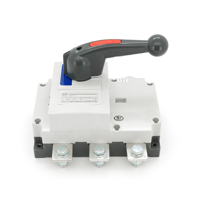 Ручной выключатель-разъединитель CHINT NH40-400/3P представляет собой трехполюсный коммутационный аппарат с ручным управлением, предназначенный для включения, отключения и переключения электрических цепей под нагрузкой. Устройство рассчитано на номинальное напряжение 380V и токовую нагрузку до 400A. Модель оснащена стандартной рукояткой для удобного управления и обеспечивает видимое разрывное расстояние для безопасного проведения работ.