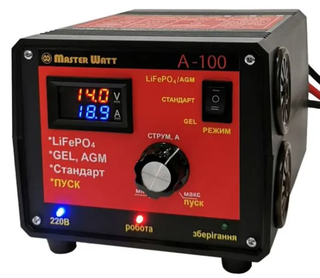 A-100 имеет защиту от короткого замыкания, от неправильного подключения полярности, от перегрева, высокого напряжения в сети. закипания» аккумулятора.