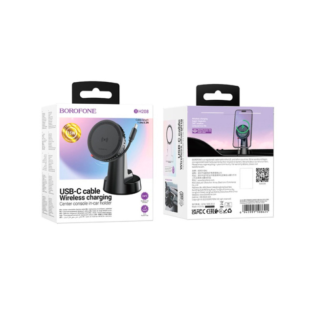 Автодержатель BOROFONE BH208 + Wireless Charging 15W, крепление на торпеду, защелка 50-90мм, Black, Box